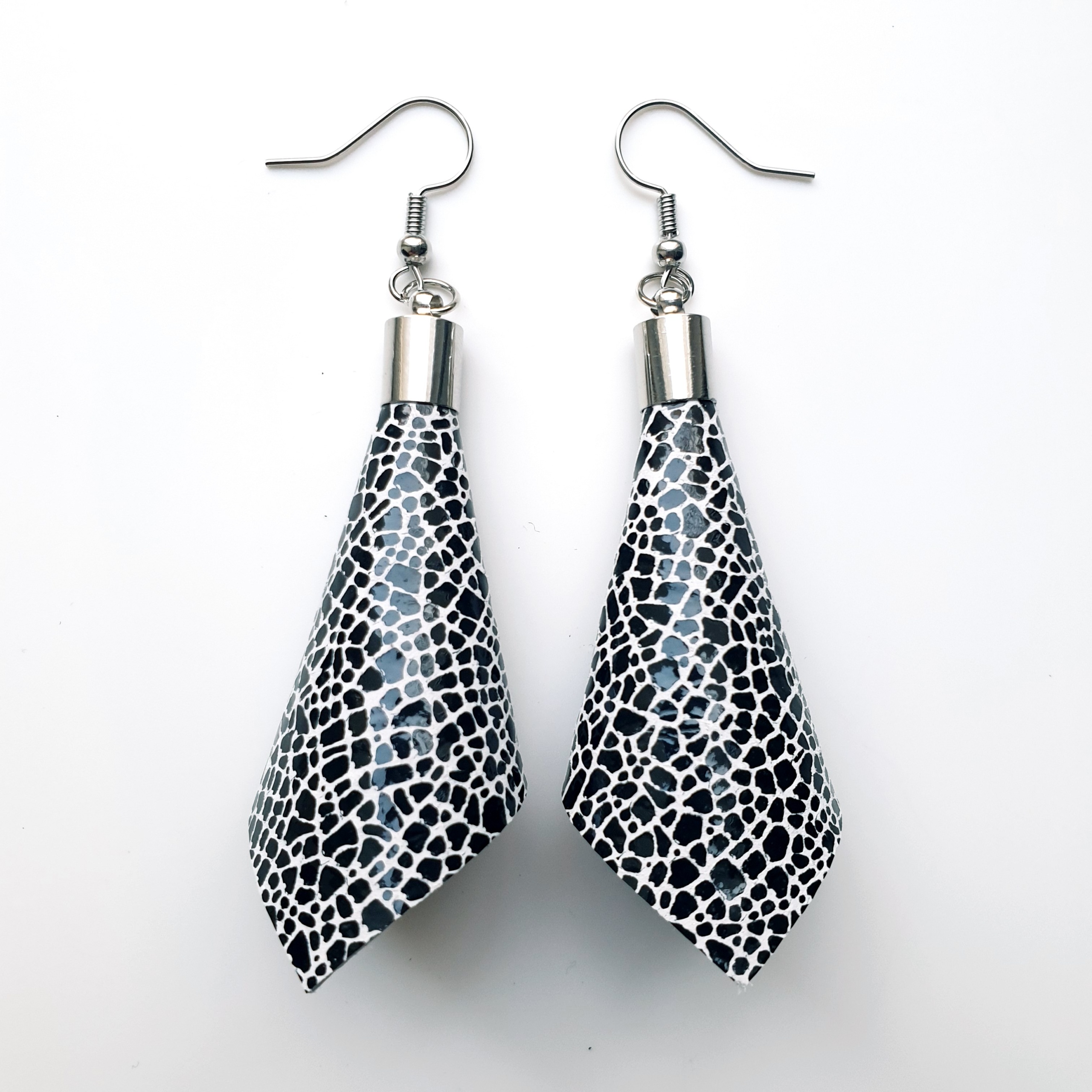 Fekete-fehér mintás, nagy tölcsér, bőr fülbevaló