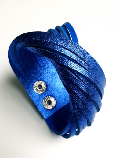Metál kék, csíkokra vágott és fonott, bőr karkötő